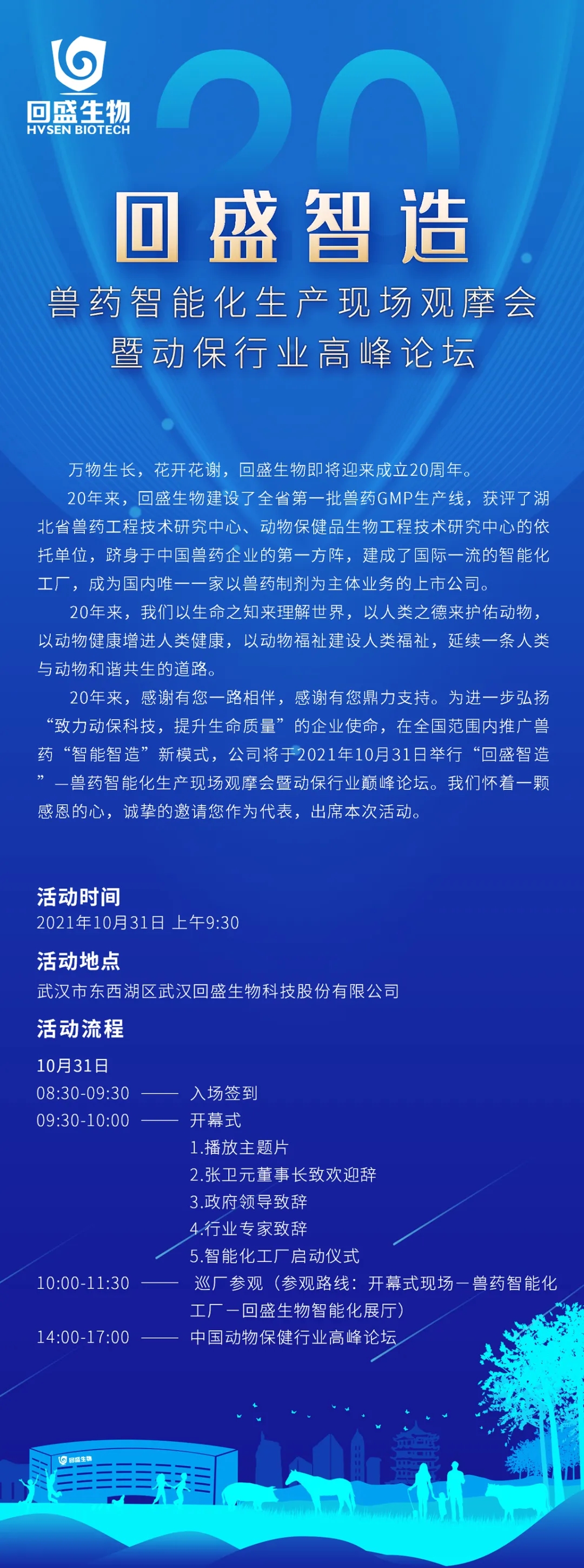 為進一步展示中國動物保健行業智能化生產水平,推廣獸藥制劑“智能智造”新模式、新體系,回盛生物將于10月31日舉辦“回盛智造”獸藥智能化生產觀摩會暨中國動物保健行業高峰論壇。