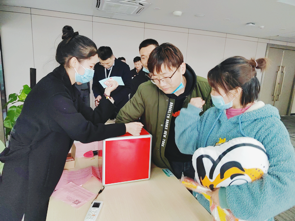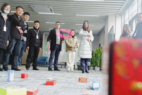 今年新增的套圈圈人頭攢動,無疑是最受大家歡迎的游戲。一張體驗券可以獲得3次體驗機會的規則明顯還不夠滿足大家的樂趣,套中“大獎”的員工引起了觀眾們的一陣歡呼與喝彩,而沒有套中的員工則有些悻悻而歸的小失落……員工們各顯神通,用實力套住新年好運氣。